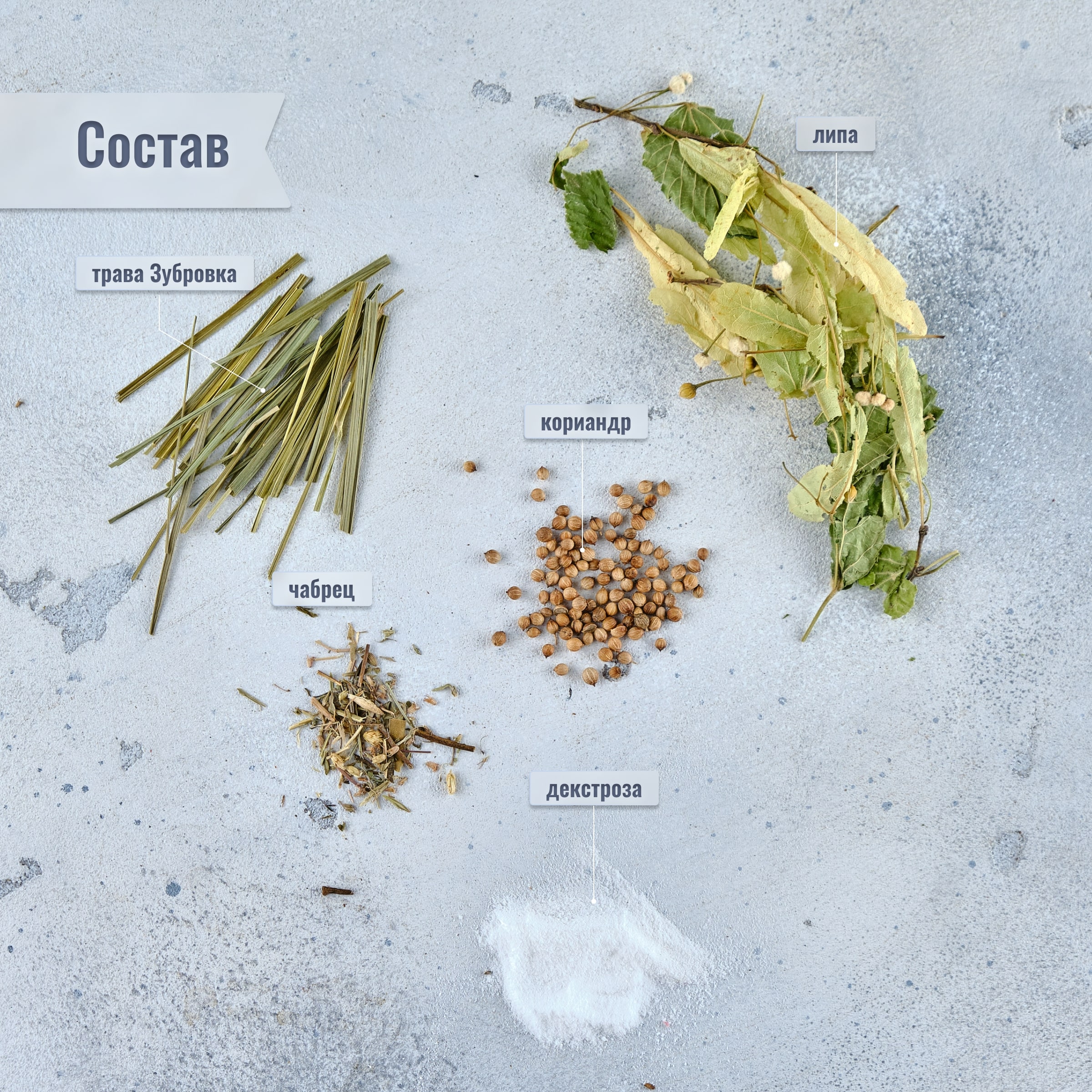 Состав набора: трава зубровка, чабрец, липовый цвет, кориандр, декстроза.
